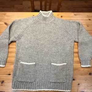 Big, cozy chunky knit wool/acrylic blend sweater with mock neck and front pockets. Has some pilling as shown, otherwise in quite good condition. Size L. Measures 22" underarm to underarm and 27" shoulder to hem.