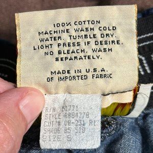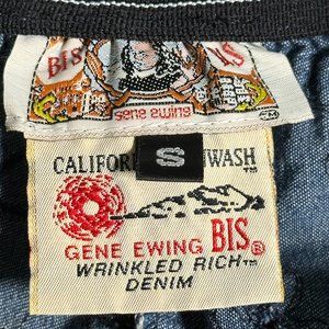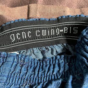 Vintage. Gene Ewing Bis. Labeled Size Small but will expand to fit up to a size Large. Pull on. Elastic gathered waist. Dark blue denim. Scalloped hem line. Very good vintage condition with no rips or stains.