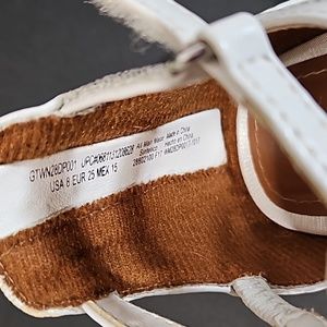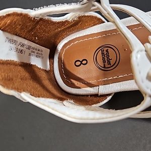 Perfect for spring! White faux leather straps adorned with two shimmery flowers per shoe. Back zipper access as well as hook and loop side closure. A few knicks at the toe, minor discoloration. See photos for more details.