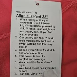 Elevate your workout wardrobe with these Lululemon Align HR Pant 28" PLBR leggings in a stunning pale raspberry pink color. The pull-on design and elastic waist provide comfort and a perfect fit, while the blended fabric is breathable and ideal for cross-training, yoga, and running. These skinny leggings feature compression technology that targets the abdomen, thighs, buttocks, and legs, enhancing your performance and providing a flattering silhouette.