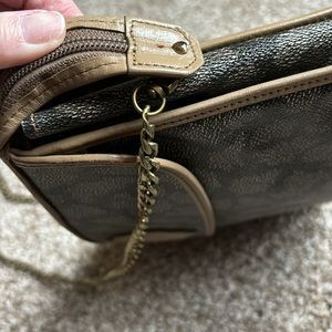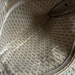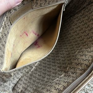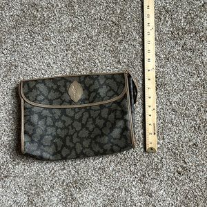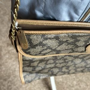Giraffe print does have some pink marker stains on inside pocket I haven’t tried to remove can add a chain to make shoulder bag or crossbody but might work better as a clutch I will include the unbranded chain. Coated canvas leather trim. Large enough for documents