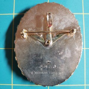 Selling a plastic brooch sold by Hallmark in 1973. Features pastel flowers on a creamy background. The back has a clasp to wear as a brooch or a hook to wear as a pendant. This item is a signed Hallmark piece in excellent condition. It is approximately 2.5 inches in height and 2 inches wide.