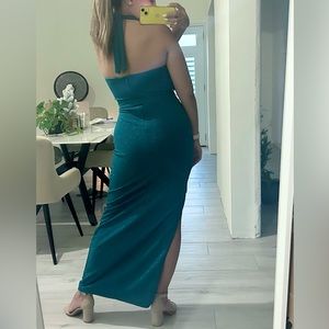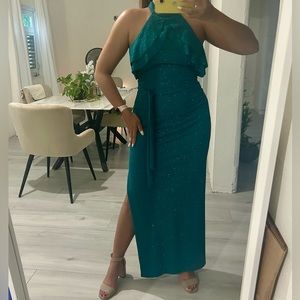 This amazing maxi dress is what you need for your next event! The fabric is glittery and stretches to fit your body. Has a waist belt and is tied around the neck. Used ONCE. Size S. Perfect for formal events, wedding, balls, graduations, proms, etc. Feel free to ask me anything.