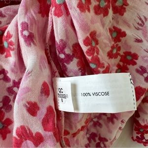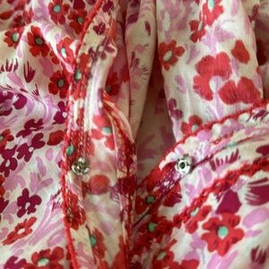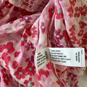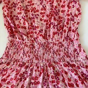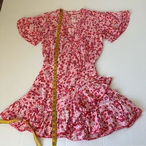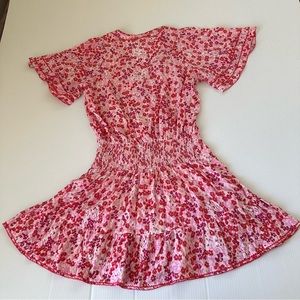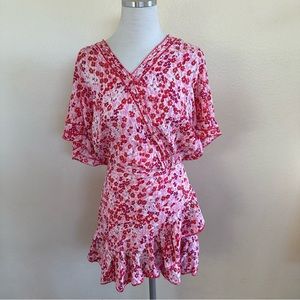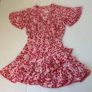 DESCRIP: Mabelle Mini Dress in a pink floral print. Features a V-neckline with embroidered trim, bell short sleeves with embroidered trim, faux wrap style with snap closure, smocked waist at back, pleated detail on hip, and layered ruffle skirt. Made from 100% Viscose.