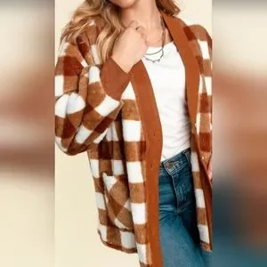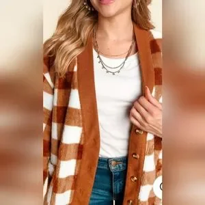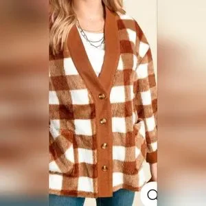 Plus Rust and White Checkered V Neck Button With Pockets Cardigan