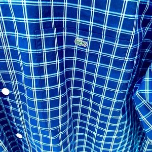 LACOSTE BIG AND TALL MENS CASUAL BUTTON DOWN SHIRT SZ45/XXL NAVY BLUE/WHITE SMALL CHECKS RARE GORGEOUS CLASSIC NAVY BLUE WITH A WHITE WINDOW PANE SET OF LINES IN DIFFERENT CONFIGURATIONS.