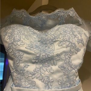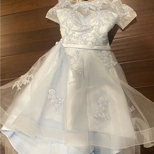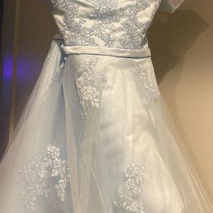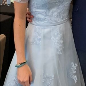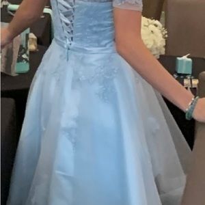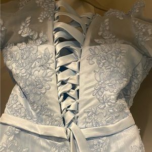 This dress was worn for a sweet 16. Was only worn once. It has no tags but was purchased from JJ’s House. The back laces up or down, is silk underneath with tulle, has a asymmetrical bottom.