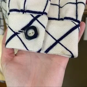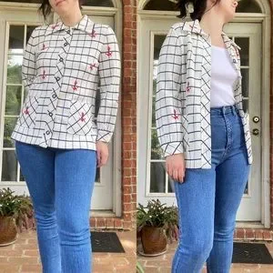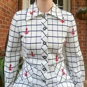 Ahoy, mateys! Thick knit grid windowpane jacket with anchor embroidery throughout. Buttons at cuffs. Button front with hidden hook + eye at collar. 1960s spread dagger collar. Slight balloon sleeve and fit-n-flare bodice with side slits. Front patch pockets. No pulls/holes but there is one small, faint mark at cuff (pictured), however I do believe it would come out easily with another round in the wash. Quality piece, has some weight to it.