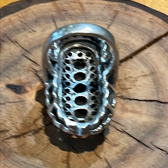 90’s warrior ring! One and a half inches silver lined rows of marcasite and garnet. One tiny marcasite the size of a pencil point is MIA: can easily be replaced. Scalloped tiered sides of silver. Stamp on ring, impossible to photograph.