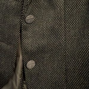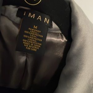 Iman tweed blazer. Size medium. Fully lined. Never worn. Two front buttons. Curved hem in front. Pleat in the back. Black/gray twee. Gray velvet like collar. Length is 26”. Pit to pit is 20” unstretched. 100% polyester. Dry clean