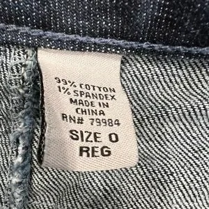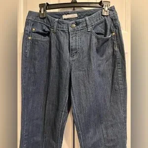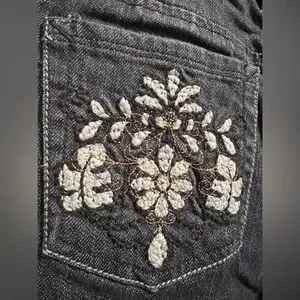 Cute & Unique Pair of Blue Jeans by CHICOS . They have a Zipper / Button Fly , Hand Pockets & Back Pockets that are Embellished with Blue & Metallic Gold Floral Embroidery. CHICOS Size 0 IS equivalent to a Size Small / Size 4 according to their Size Chart -