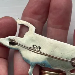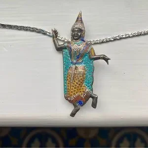 Stamped sterling Siam, this wonderful ornate character has a lot of detail and beautiful color, it’s a pin and may be clasped onto a chain and worn as a necklace as well, I can include the chain on request- the chain is not stamped and is approximately 20” must be coated, it doesn’t tarnish.
