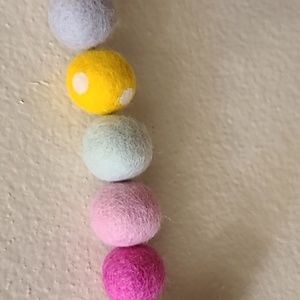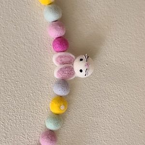 42" long felt garland with 1" pastel balls and white bunnies. String is 14" on one side and 13" on other side