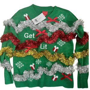 Features tinsel, Christmas cheer with various symbols, and says, "Get Lit".