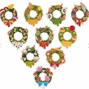 Deck the halls of your Disney Pin collection with the Christmas Wreath Mystery Pin Set. These decorative designs are uniquely themed to classic animated features. Each mystery pack contains two randomly selected cloisonné pins from a possibility of ten different designs, finely detailed, with a golden finish.