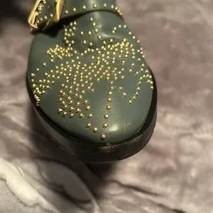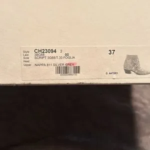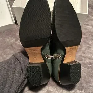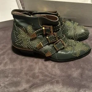 Beautiful Chloe ankle boots. They are a beautiful kind of slate gray with brass studs and hardware. They have been worn twice. There is a little mark on the right toe, and a little dark mark on the left heel. No missing studs. I had non slip soles added. The box lid is beat up and stained from being stored but the shoes are almost perfect. They will include the box, dust bags and authenticity card. They are a 37.