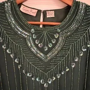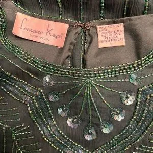 Vintage 1980s Laurence Kazar Emerald Green Beaded & Sequins Silk Top. Has the traditional 80s shoulder pads. There is one line with missing beads on back. See pic for details. Size Large Shell is 100% Silk and Lining is 100% Polyester. Spot clean only. Laying flat, pit to pit 22” shoulder to shoulder 16.25”