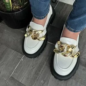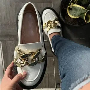 A pair of faux leather loafers featuring an almond toe, high-polish curb chain detailing on the vamp, slip-on styling, and a lug platform sole.