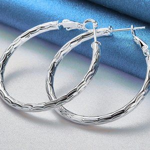 Beautiful .925 Sterling Silver 40mm Wave Stripes Round Hoop Earrings