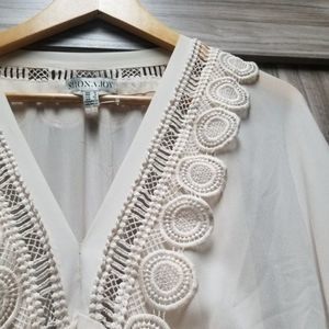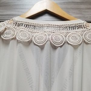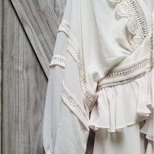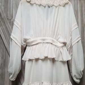 This dress features a low plunged neckline with crochet trim, gathering under bust, fitted waist with decorative buttons and peplum ruffle, midi length voluminous sleeves with elasticated cuff, invisible side zip, mini skirt with asymmetrical ruffle hem and lining.