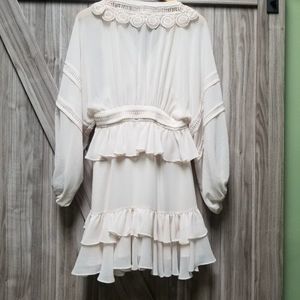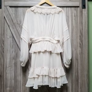 Perfect dress ruffle mini dress in a light weight chiffon with a semi-sheer appearance in a creamy bone hue.