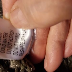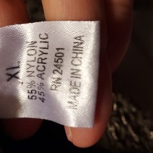 The IF Collection sweater is preowned. It is avocado/loden green in color with an interesting ribbon knit, 55% nylon 45% acrylic fabric. Hand washing in cold water is recommended.