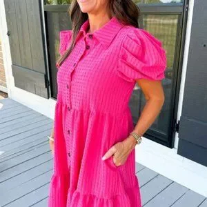 Basic Collared Button Down Dress, a versatile addition to your wardrobe. Made with detailed fabric and wood button detailing, this dress is both stylish and comfortable. Featuring a button-down front and side pockets, it's perfect for everyday wear. The tiered dress design adds a touch of femininity, while the puff and balloon short sleeves give a playful touch. The baby doll style of this dress is flattering on all body types. Wear it to work or dress it up for a special occasion, this dress is sure to become a staple in your closet.