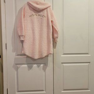 This robe really catches your eye! Comfortable and stylish. Not like the boring,typical robe. Its pink with the word "Homebody" in gold on the back and super soft material. Size is small/medium.