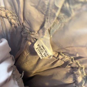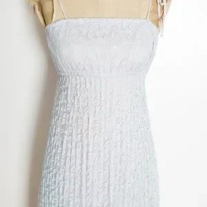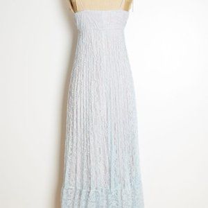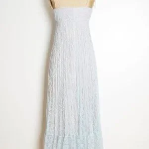 This is a gorgeous vintage maxi dress from the 70s. It's made of light blue nylon lace (fully lined with lavender acetate). This dress has an elastic waist and neckline, string tie straps, and it slips over the head with no closure.