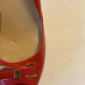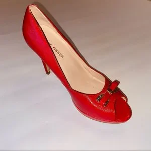 Marc-Fisher Peep-Toe Stilettos. Bright red with embellished bow. Very sophisticated. Size 8. Display shoes. 3.5 “heel.