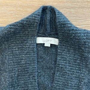 Loft sleeveless cardigan. Color is black with some gray. Size XS/S. Material 5/% acrylic, 20% wool, 17% nylon, 8% alpaca, 3% spandex. Length from mid shoulder ~32.5”.