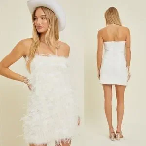 Calling all my bougie on a budget brides! The Forever and Ever White Feather Mini Dress is the perfect dress for any bridal event, shoot or bachelorette you have planned! This mini dress has a strapless neckline, bodycon fit and a full feather front. The dress has an enclosed back zipper. This is the perfect piece to dance all night in. Just throw on your favorite heels or boots and get ready to celebrate. This dress also pairs excellently with champagne.