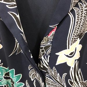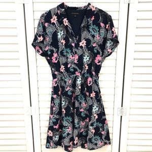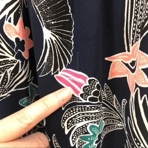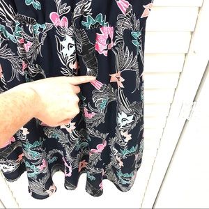 Gorgeous and fluttery floral on a dark navy background. Print depicts birds and flowers. Buttons up front. Even has pockets!! Lined. Has a tiny run in the pleats in front. Hard to see and not obvious but it is there. See last two pics.