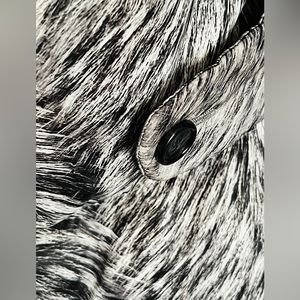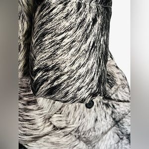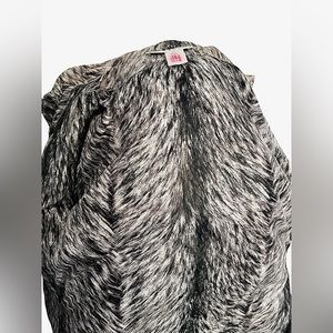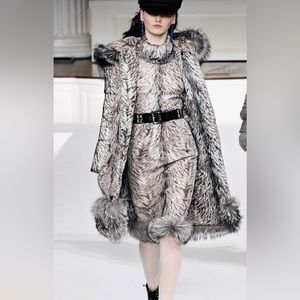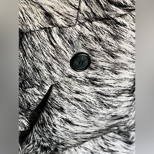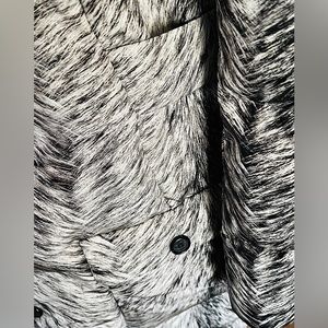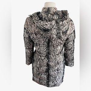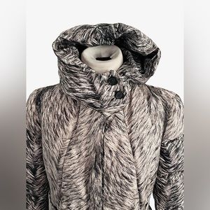 This is your chance to own this rare iconic piece from such a renowned fashion designer like Oscar De La Renta. This jacket has a gray fur print on it and is stunning in person. It buttons up and has a hood to keep you warm. This coat is a statement piece for any fashion enthusiast.