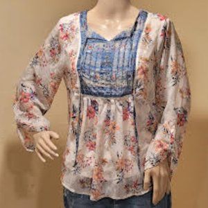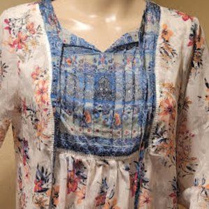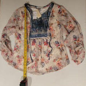 Very flattering style with fun detailing in front top. Llightweight sheer flowy boho chic top. Inner shell is a solid cream/ivory color. Sleeves have a single side button to give more flow to the whole look. (extra button with tag)