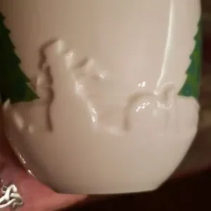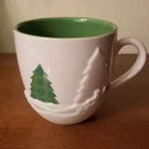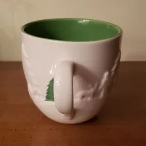 Delightful Starbucks Holiday 2006 Ceramic 16oz Mug with embossed winter scenes and green Christmas Trees. In excellent condition, no chips, cracks, crazing or fading of colours. Measurements shown in photos.
