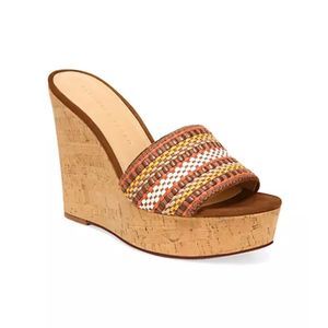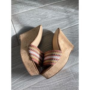 These wedge sandals feature a multicolored woven vamp with a cork midsole.