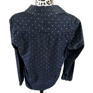 seven 7 Top Blouse L Blue Button Up Silver Polka Dot Pearl Snap Pockets Classic