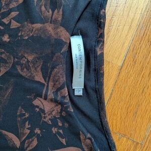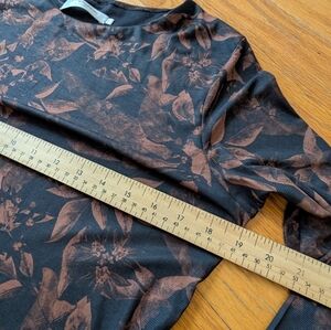 Chic floral blouse with long sleeves. Black and brown pattern. Ideal for versatile styling.