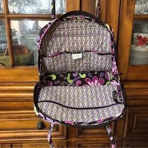 This EUC Vera Bradley shoulder bag has a long, double fob zipper closure, a daisy floral print, and a firm base. The exterior has two magnetic flap pockets, and a long zipper pocket. The interior has three pouch pockets and a long zipper pocket. It is 100% cotton. Measurements (in inches) height-9 1/2, width-12 1/2, depth-5. A