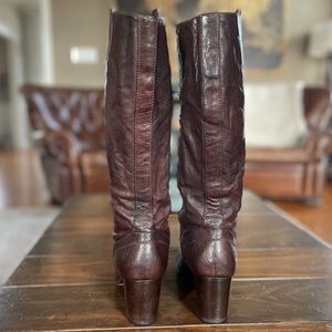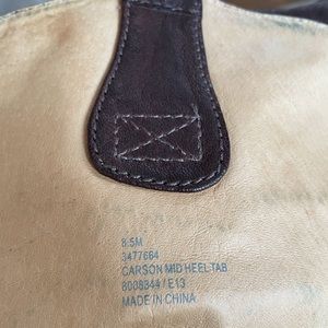 These Frye Mid Heel Tab boots are in a rich chocolate brown leather with block heels. The tabs certainly make it easier to pull these boots on. All Frye products are built to last. These are the type of shoes you take to a cobbler for extending the lifecycle.