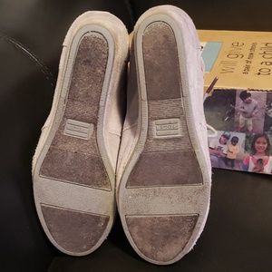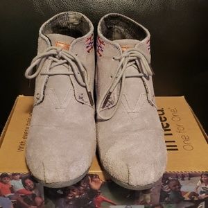 Tom’s Wedge Booties. Gray Suede with Red and Purple Stitching with a Black Stitching Design.