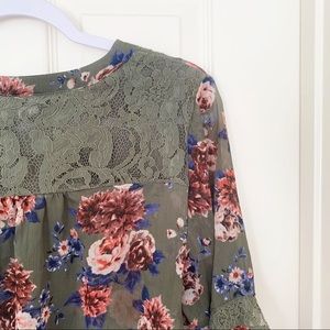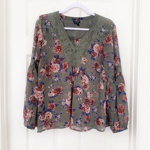 torrid Floral Print Chiffon Lace Inset Top in Olive Green, size 00 (M/L). Super pretty and lightweight top, perfect for winter! Relaxed fit blouse in chiffon is a floaty, airy must-have. Blue/pink rose print adds a dreamy feminine touch. Lace insets trim the v neck and bell sleeves. Elastic sleeve cuffs. Perfect for work or weekend, versatile top that you'll wear all year!
