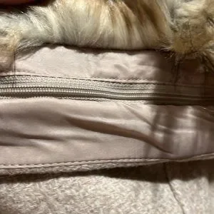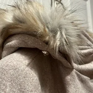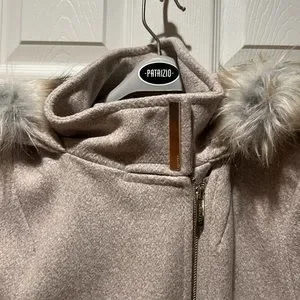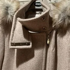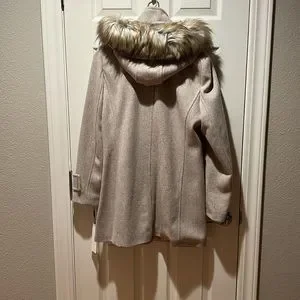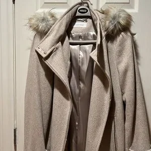 Brand new! Wool blend,front zip and zip side pockets. Detachable fur on hood. Cream satin lining. Beautiful stylish coat.