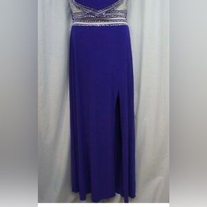 Bottom is detailed along waist with same sheer & jewels, laying flat measures 12in across the waist & approximately 40in long, slit down the left front side beginning at 15 1/2in from waist, zips in back & additional clip above zipper for snug fit