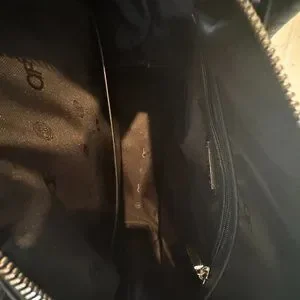 This beautiful bag is more structured so it keeps it shape. The pebbled leather is in amazing shape. Great for travel or work. Zipper is in great shape. Interior is black branded material with no stains. Fits on a should.