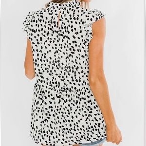 ANGASHION Dreaming of New Adventures Spotted Babydoll Ruffled Tiered Top. Gorgeous spotted white and black babydoll top with short ruffle cap sleeves! Keyhole back. This top is made of a silky material that will keep you cool and comfortable all day!