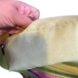 Multi colored canvas bag is absolutely gorgeous just needs a little cleaning on the inside it has white stuff could be powder please refer to last photo. She’s ready to be rehomed. Strap is in great condition