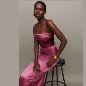 Reformation Frankie Silk Dress + Strawberry Wine Rosette NWOT