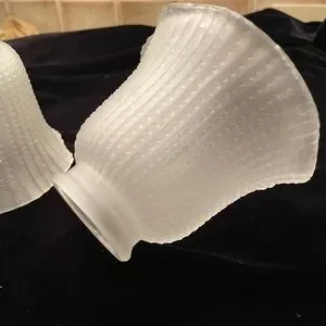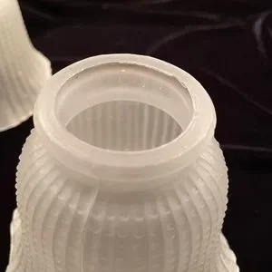 Set of 3 …These were original to our Circa 1929 New England home. Lovely ruffled bottom @ 5” diameter. Lightly frosted with beaded motif. Fitter, which attaches to the fixture itself is 2-1/8” diameter Overall Height is 4” from base to top of fitter.